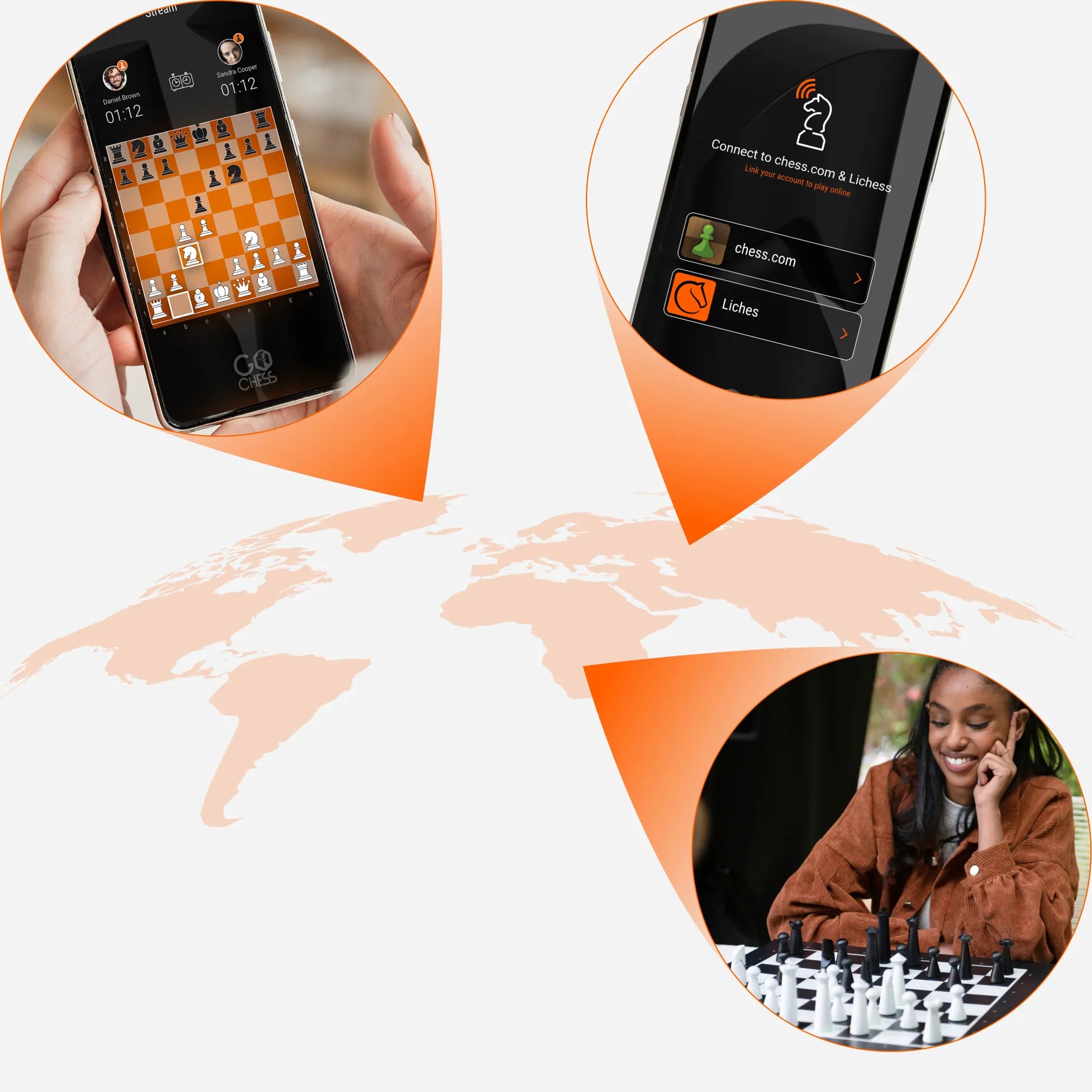 GoChess has a mobile app (Android and iPhone) which connects online to gaming platforms (the most popular platforms are Lichess and Chess.com) so you can play online with people around the world or with AI.