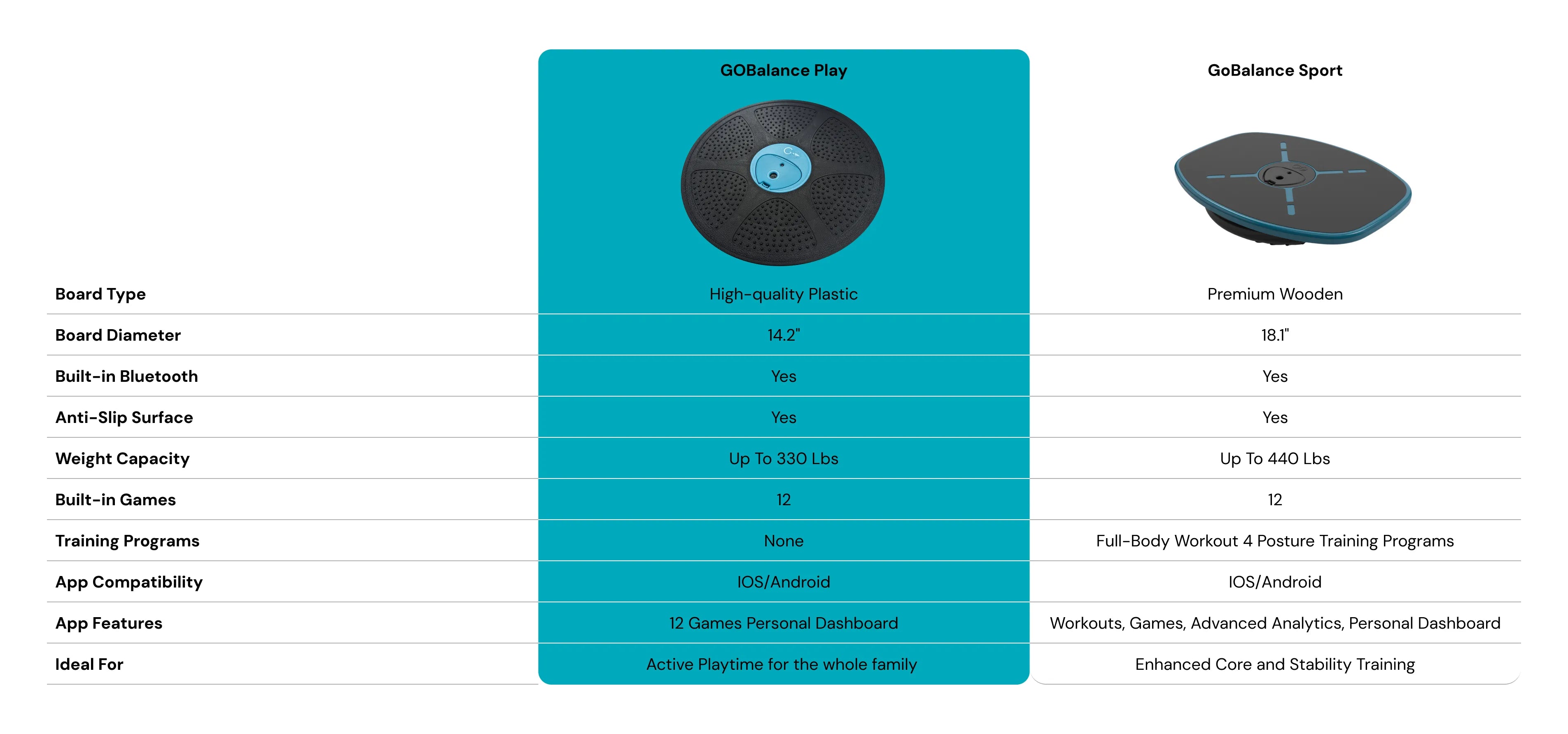 GoBalance Sport: Designed for advanced balance training and fitness routines, offering a more challenging workout experience suitable for fitness enthusiasts and athletes.